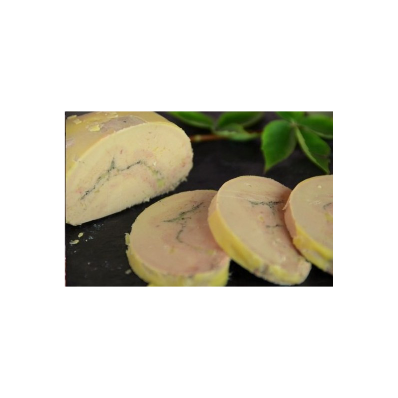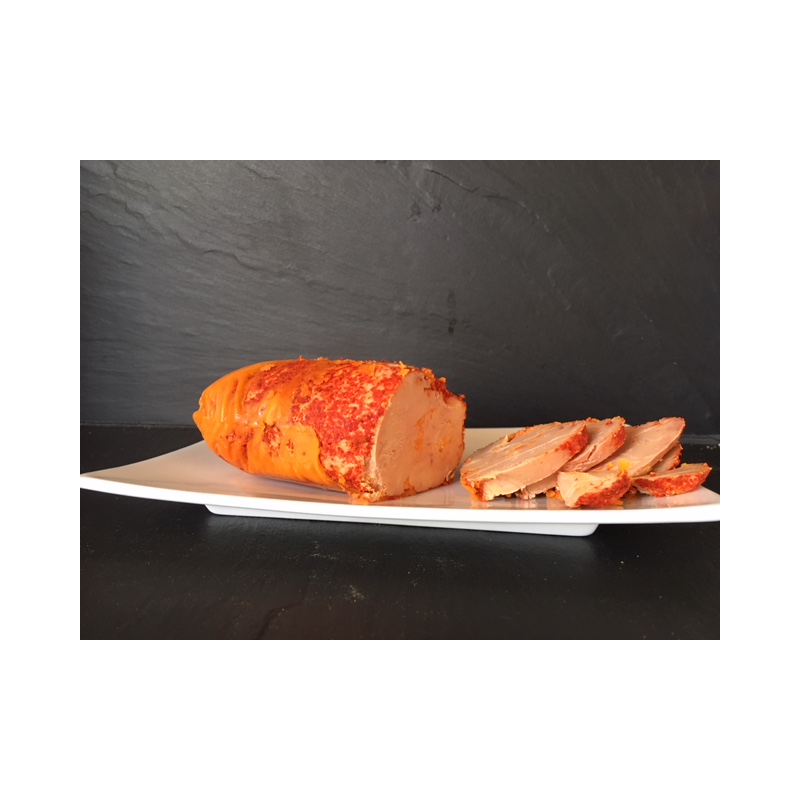 Ingrédients : Foie Gras de canard au piment d'Espelette Mi-cuit sous-vide. Foie gras de canard, sel, piment d'Espelette AOP 0,3% Origine France (Photo non contractuelle)